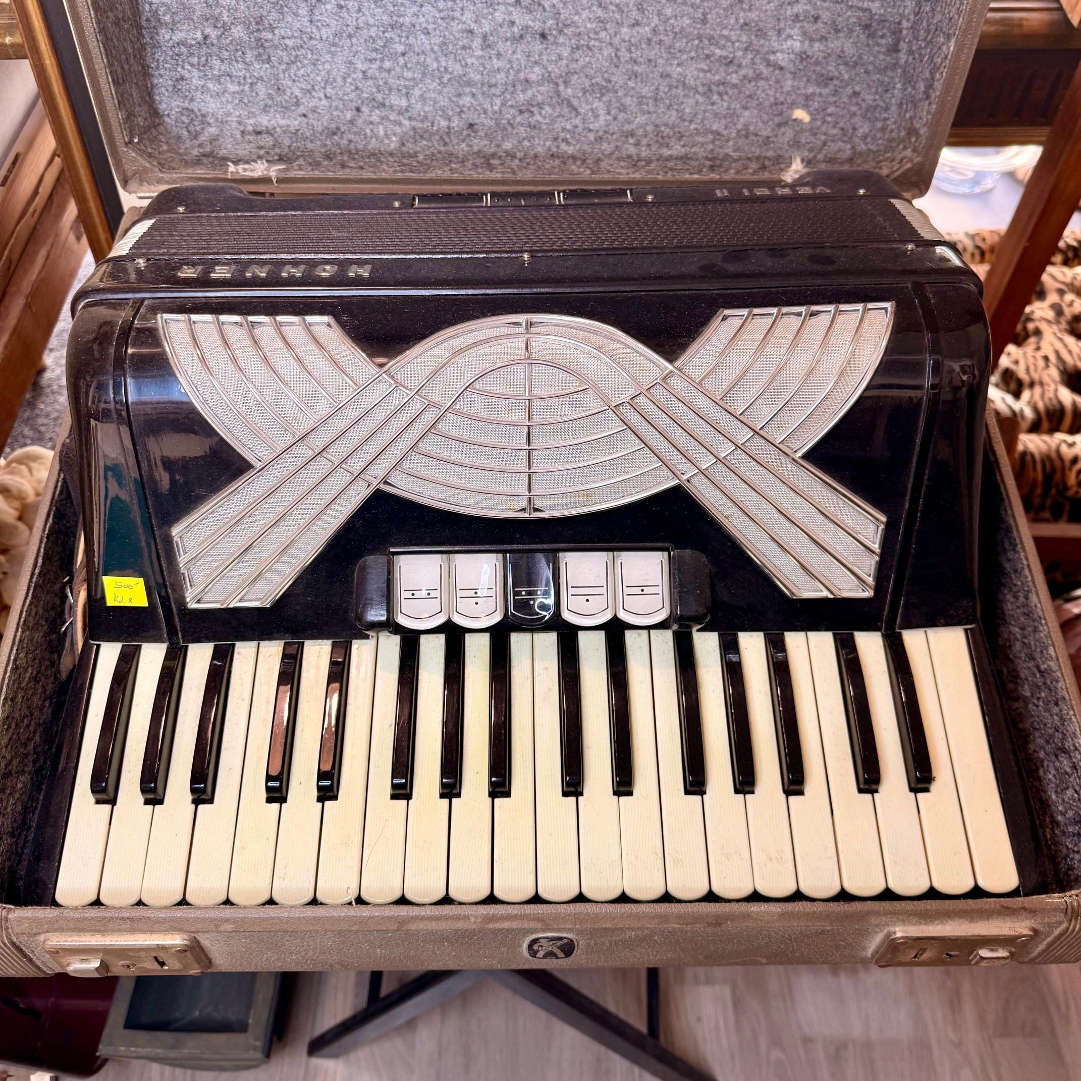 Acordeón clásico Hohner modelo Verdi II, fabricado por la reconocida firma alemana especializada en instrumentos musicales desde el siglo XIX. Presenta diseño característico con teclado de piano y acabado negro con detalles metálicos decorativos. Este tipo de acordeón es apreciado tanto por músicos aficionados como por coleccionistas de instrumentos tradicionales.