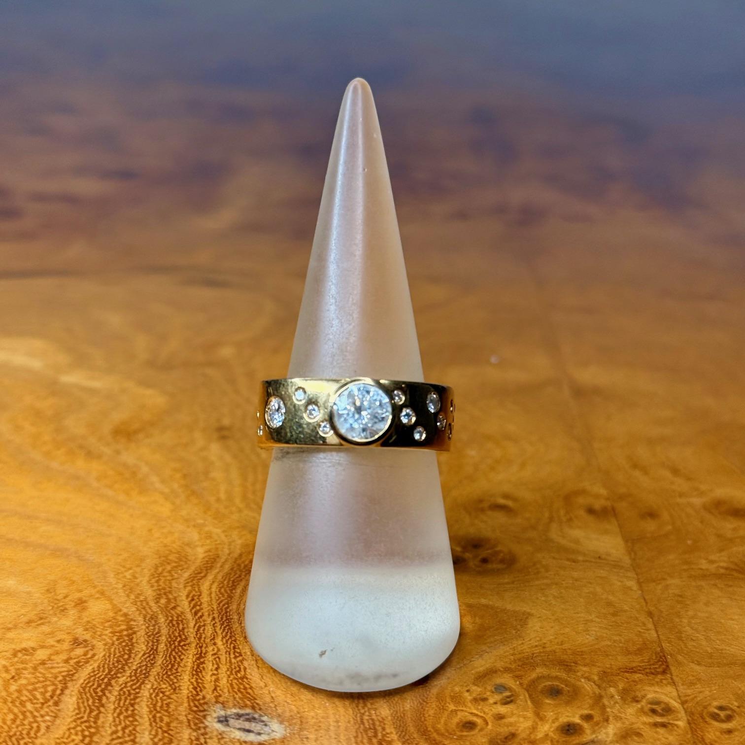 Anillo elaborado en oro amarillo de 18 kilates con diseño elegante y contemporáneo, decorado con varios brillantes engastados en la banda. En el centro destaca un brillante principal de aproximadamente 0,8 kilates que aporta gran luminosidad a la pieza. Su diseño equilibrado combina presencia y sofisticación, convirtiéndolo en una joya ideal tanto para uso diario como para ocasiones especiales.