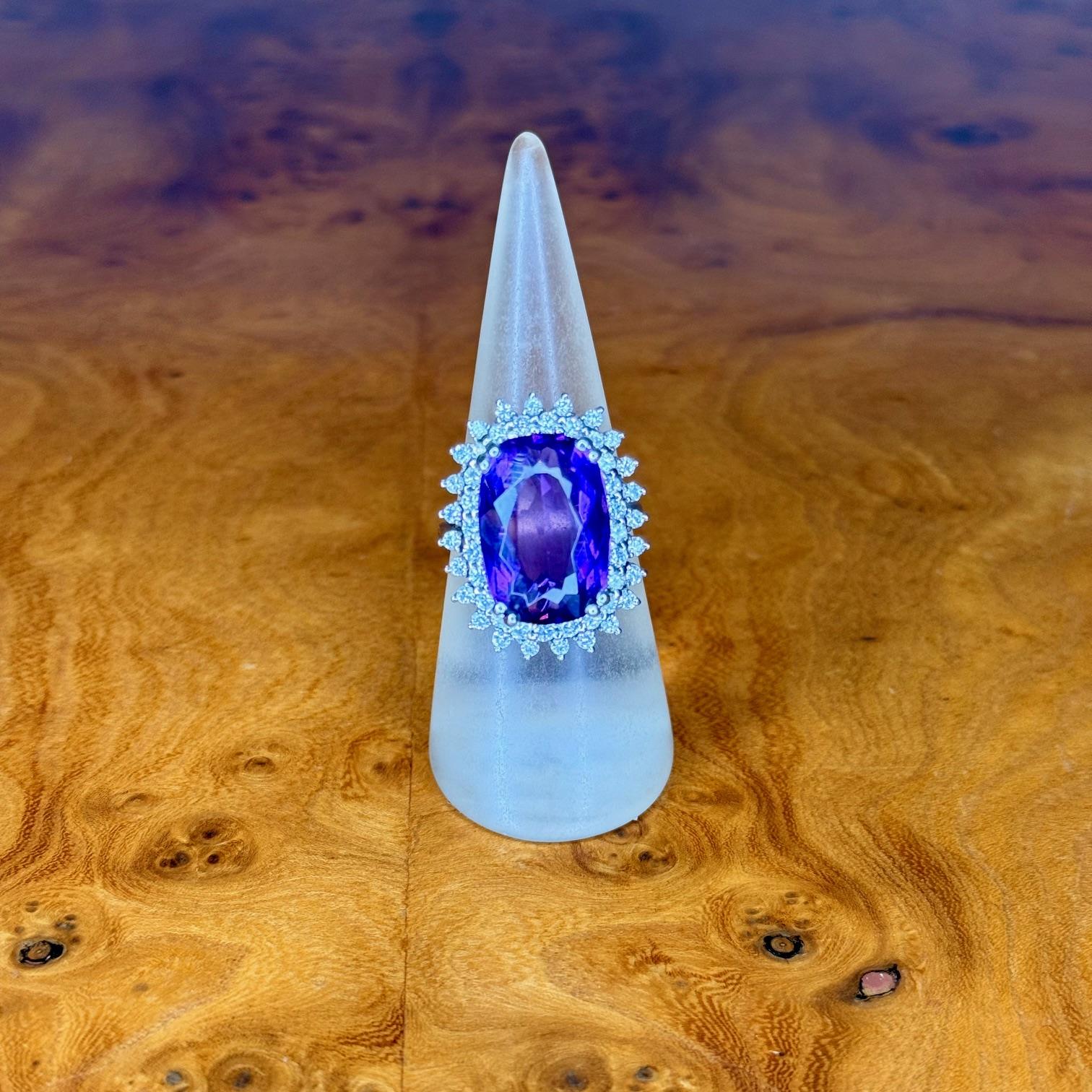 Elegante anillo elaborado en oro blanco que presenta una piedra central de tono violeta (topacio) rodeada por un halo de pequeños diamantes que realzan su brillo y color. El diseño combina sofisticación y carácter, creando una pieza llamativa y refinada, ideal tanto para ocasiones especiales como para colección.