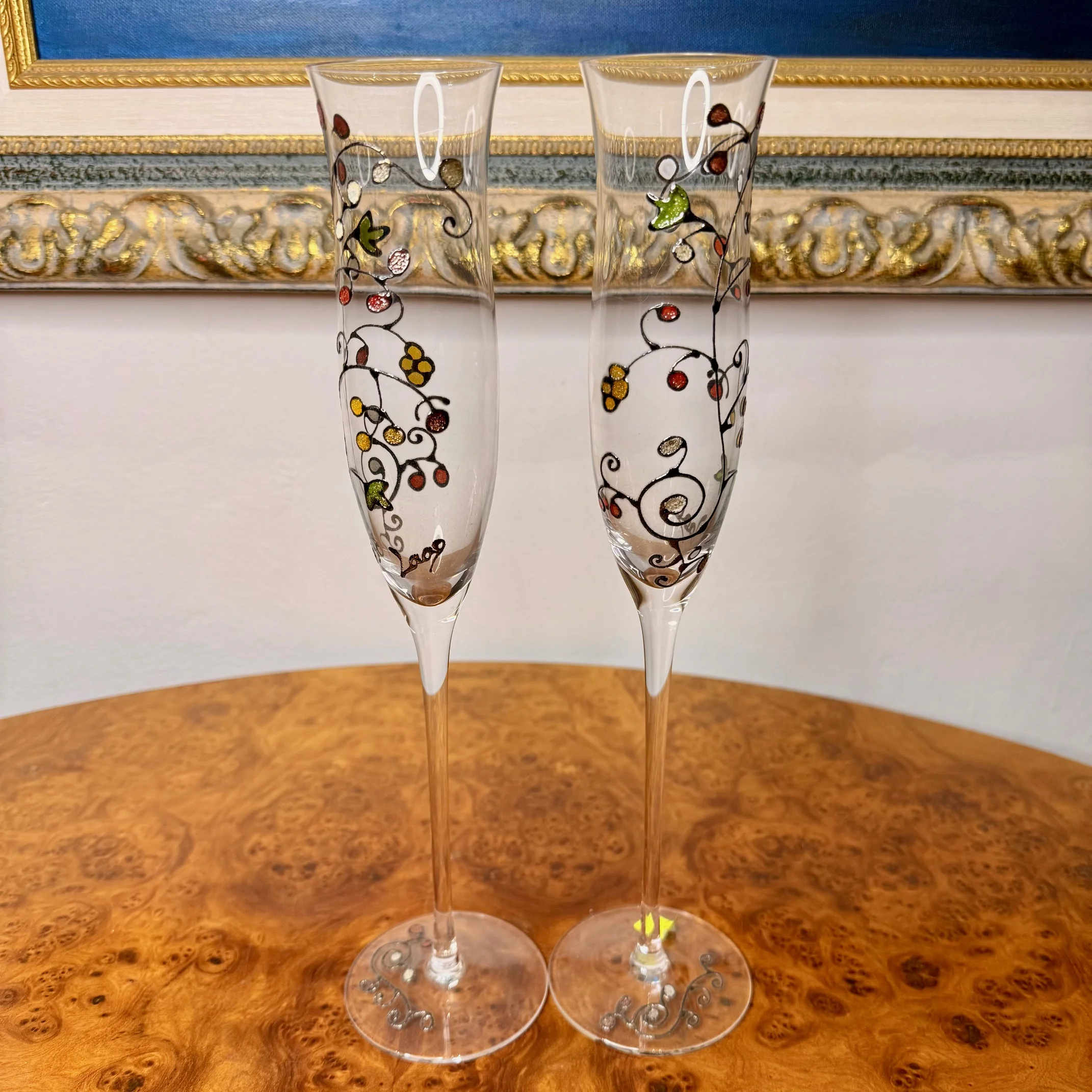Pareja de elegantes copas de cristal fino, decoradas artesanalmente con motivos florales en colores. Cada pieza está pintada a mano, lo que las convierte en únicas. Realizadas con motivo del cambio de milenio (año 2000), combinan delicadeza, diseño y valor decorativo. Ideales tanto para uso como para colección.
