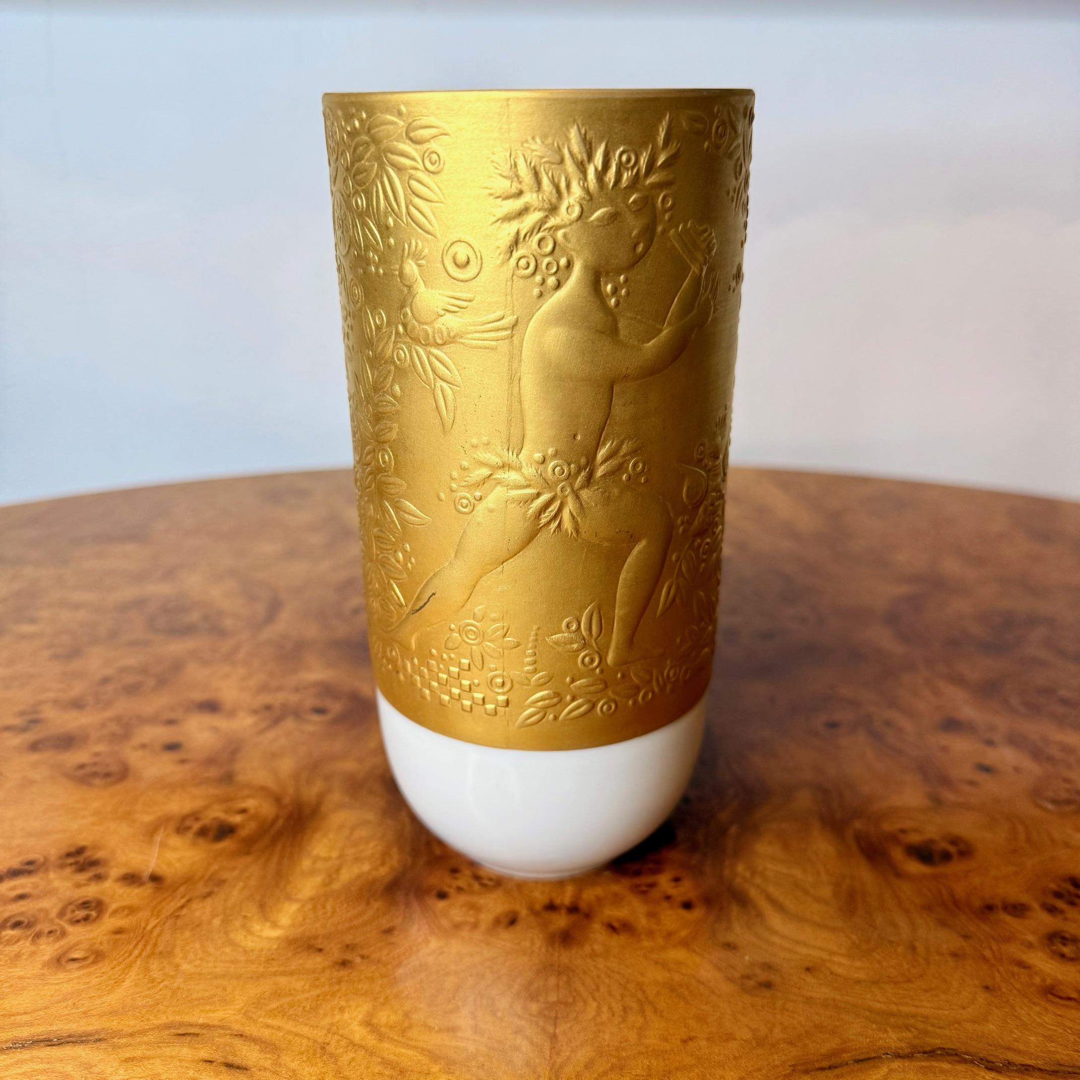 Elegante jarrón de la firma Rosenthal perteneciente a la colección “Zauberflöte”, conocida por sus delicados relieves inspirados en la ópera de Mozart La flauta mágica. La pieza presenta un acabado dorado con finos motivos en relieve que representan figuras y elementos decorativos de inspiración clásica. La base en porcelana blanca crea un elegante contraste con la parte superior dorada, dando como resultado un objeto decorativo de gran sofisticación.
