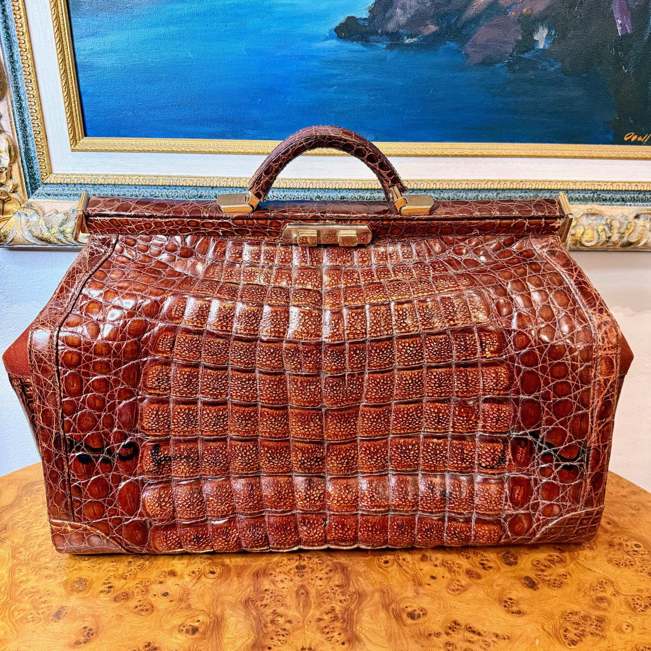 Exclusivo maletín de médico elaborado en auténtica piel de cocodrilo con acabado en tono marrón brillante. Destaca por su estructura rígida, asa superior reforzada y cierre metálico central. Este tipo de pieza combina funcionalidad con lujo, siendo muy apreciado tanto por su calidad artesanal como por su carácter vintage. Ideal como objeto de colección o complemento distintivo.