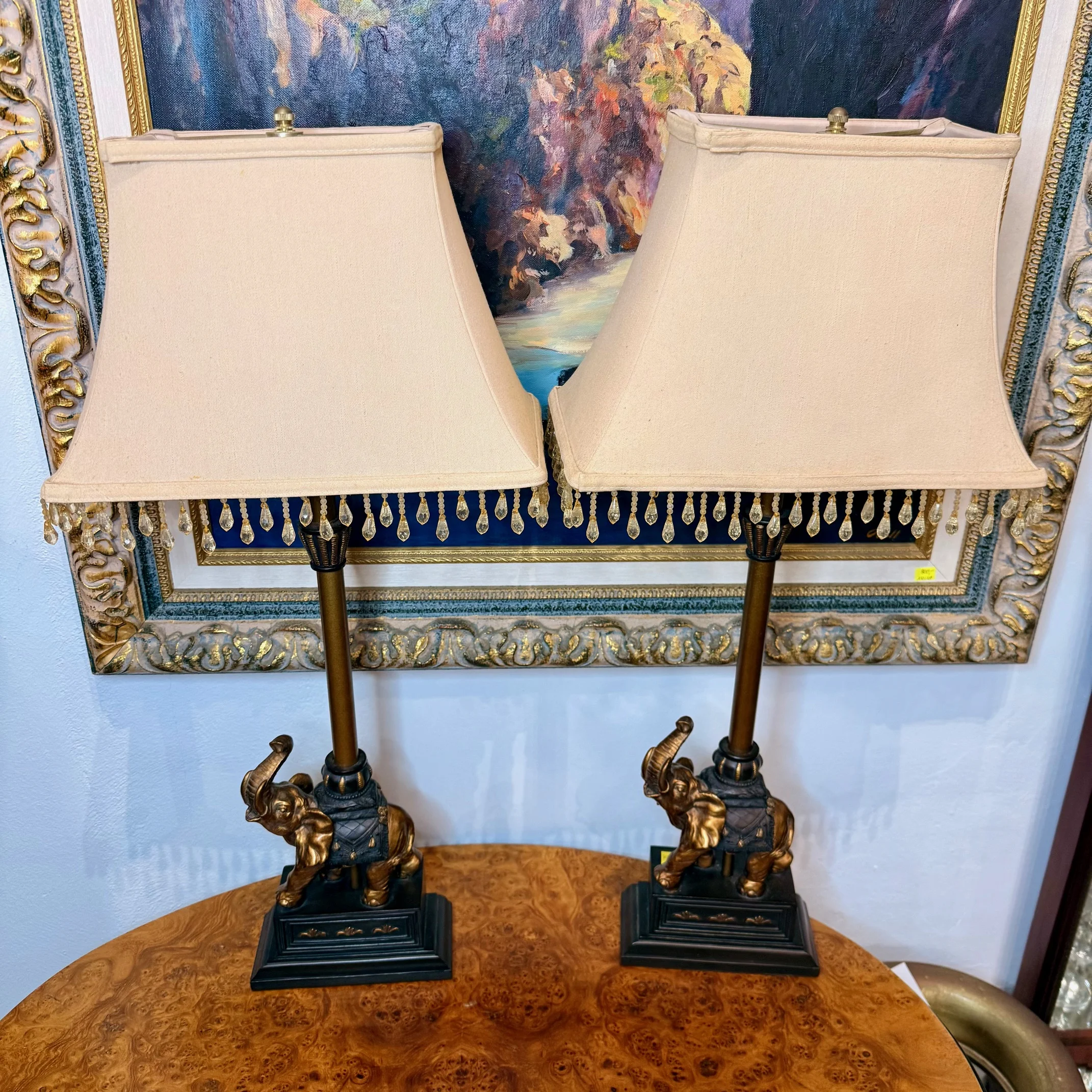 Elegante pareja de lámparas de mesa con base decorativa en forma de elefante en acabado dorado sobre peana oscura. Las pantallas textiles en tono beige están rematadas con flecos de lágrimas de cristal, aportando un aire clásico y sofisticado. Ideales para ambientes tradicionales o eclécticos, estas piezas destacan por su carácter decorativo y su calidez lumínica.